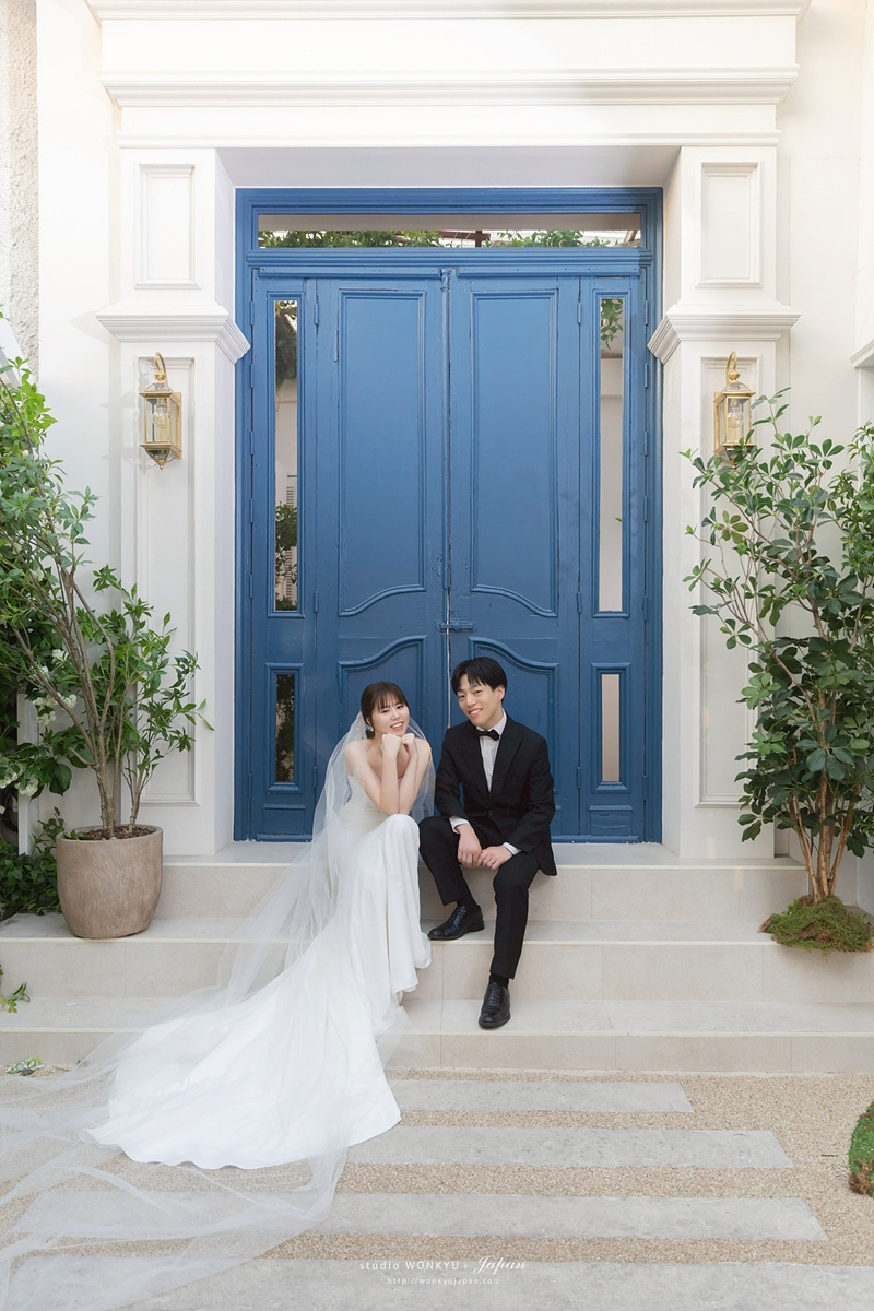 青いドアの前で座る新郎新婦