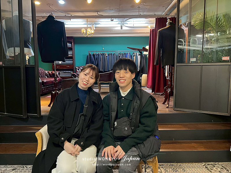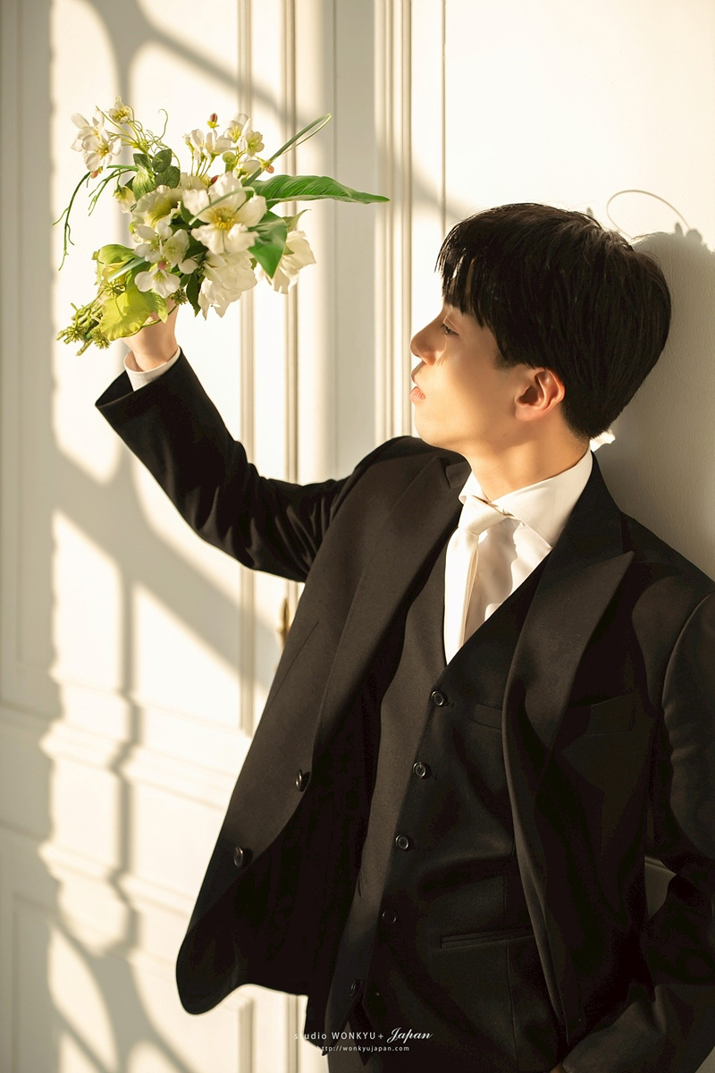 カーキタキシードは柔らかい雰囲気を演出でき、ナチュラル光のスタジオにとても相性が良い一着でした。