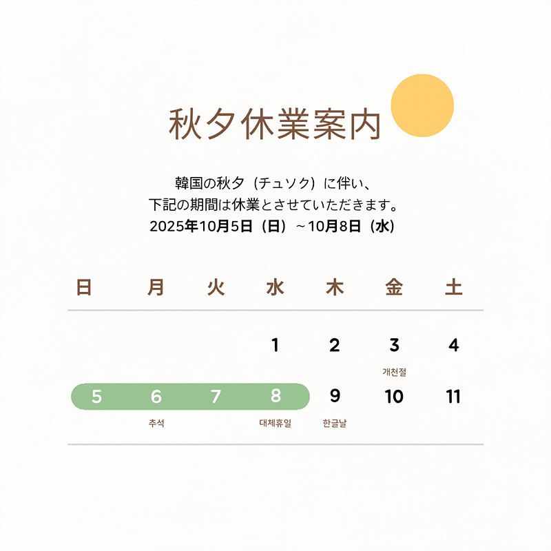 韓国の秋夕(チュソク・お盆にあたる連休)に伴い、下記の期間は休業とさせていただきます。