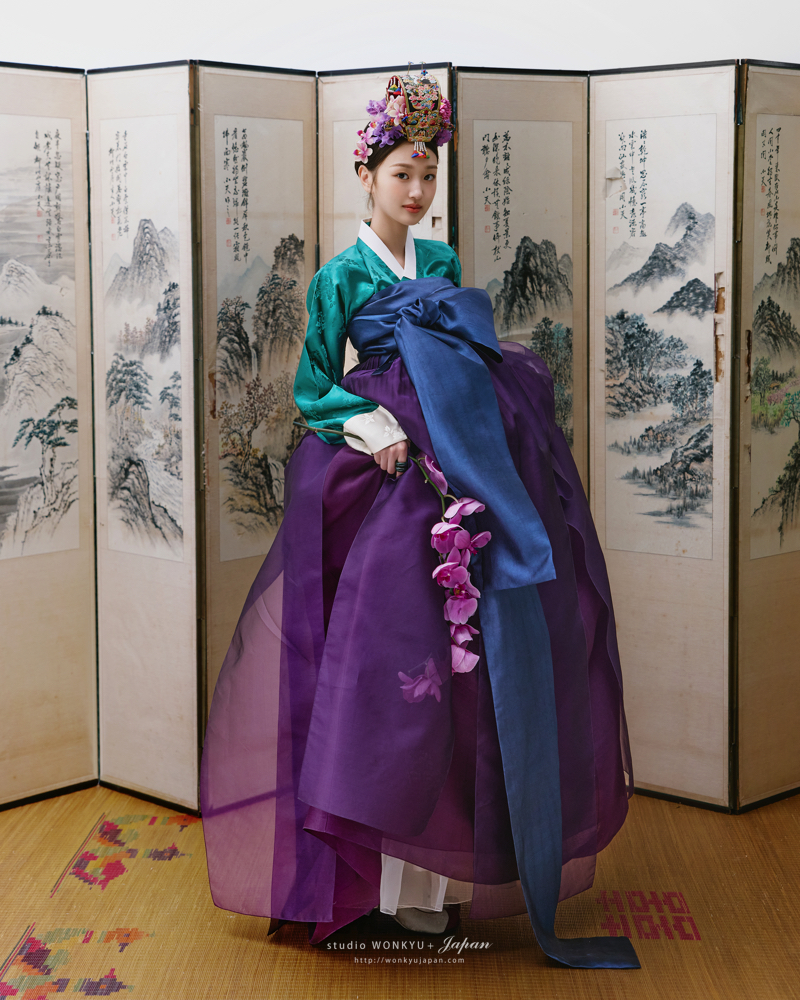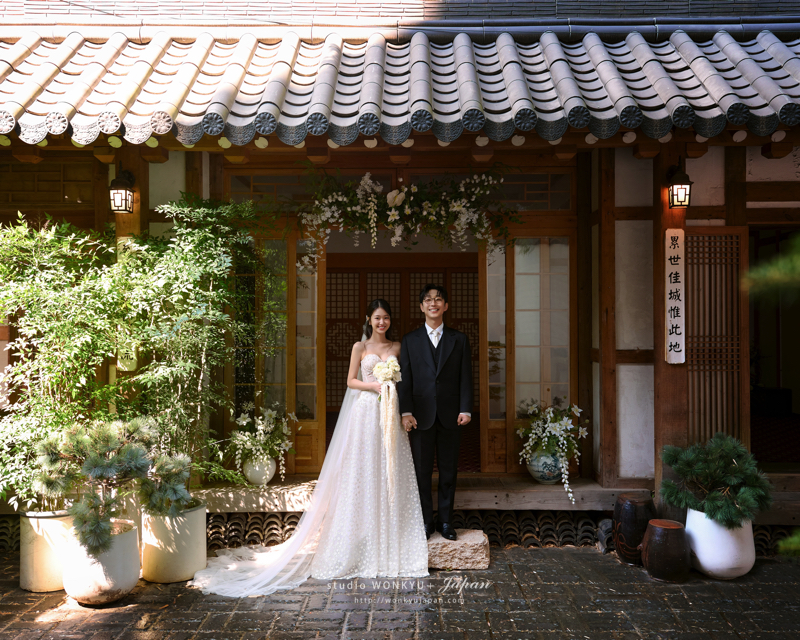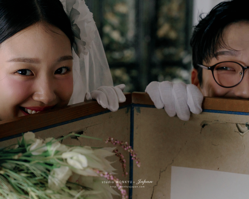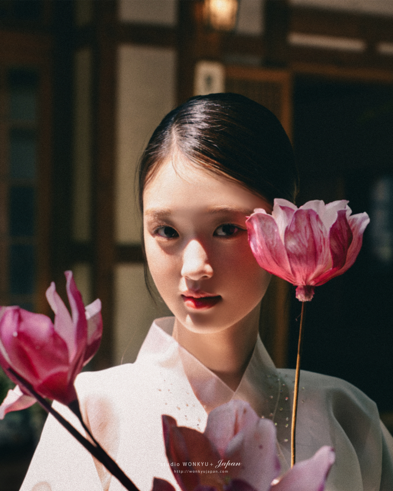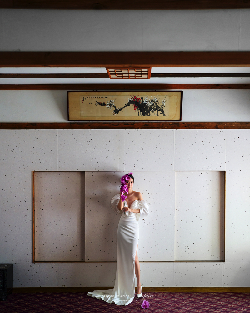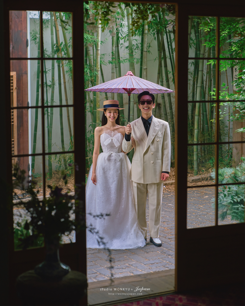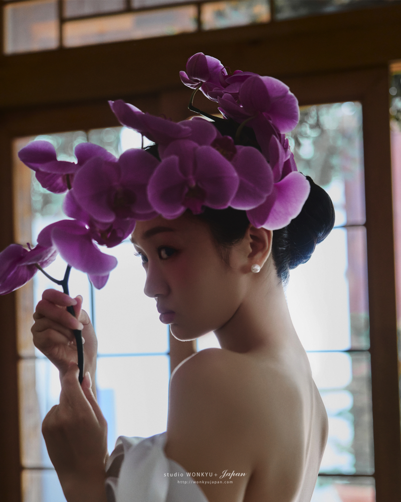伝統的な建築や屏風を背景に、色彩と質感を活かした撮影。落ち着いた演出で上品に仕上げます。